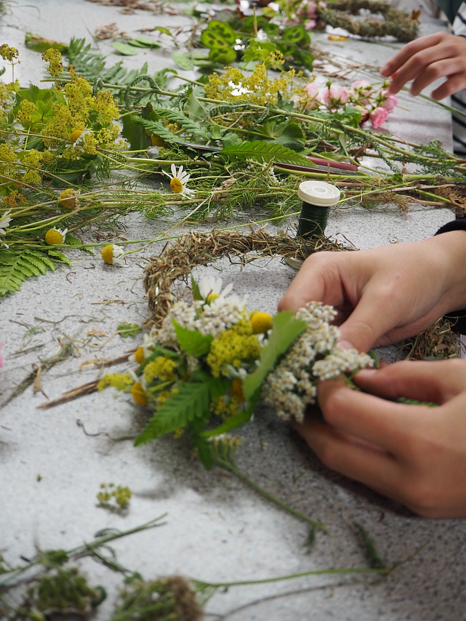 Wiesenkränze aus Gräsern der Umgebung, Tischschmuck mit Gartenblumen, Marmelade oder Saftkochen aus selbstgepflückten Erdbeeren